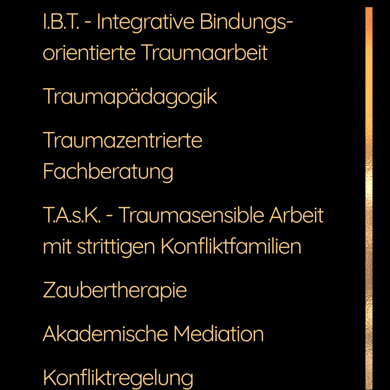 Ich begleite Kinder ab dem Säuglingsalter, Jugendliche, Erwachsene, Schwangere und Mütter nach der Geburt, Familien und Paare in herausfordernden Zeiten, mit herausforderndem Verhalten, nach (frühkindlicher) Traumatisierung, in Konflikten und Trennungs-/Scheidungssituationen, sowie Fachkräfte mit traumasensiblem und bindungsorientiertem Blick. Mein Ansatz verbindet integrative bindungsorientierte Traumaarbeit, Traumapädagogik, traumasensible Arbeit mit (hoch-)strittigen Konfliktfamilien, Zaubertherapie, sowie traumasensible Beratung in komplexen und hochbelasteten Familiensystemen und Krisenintervention.